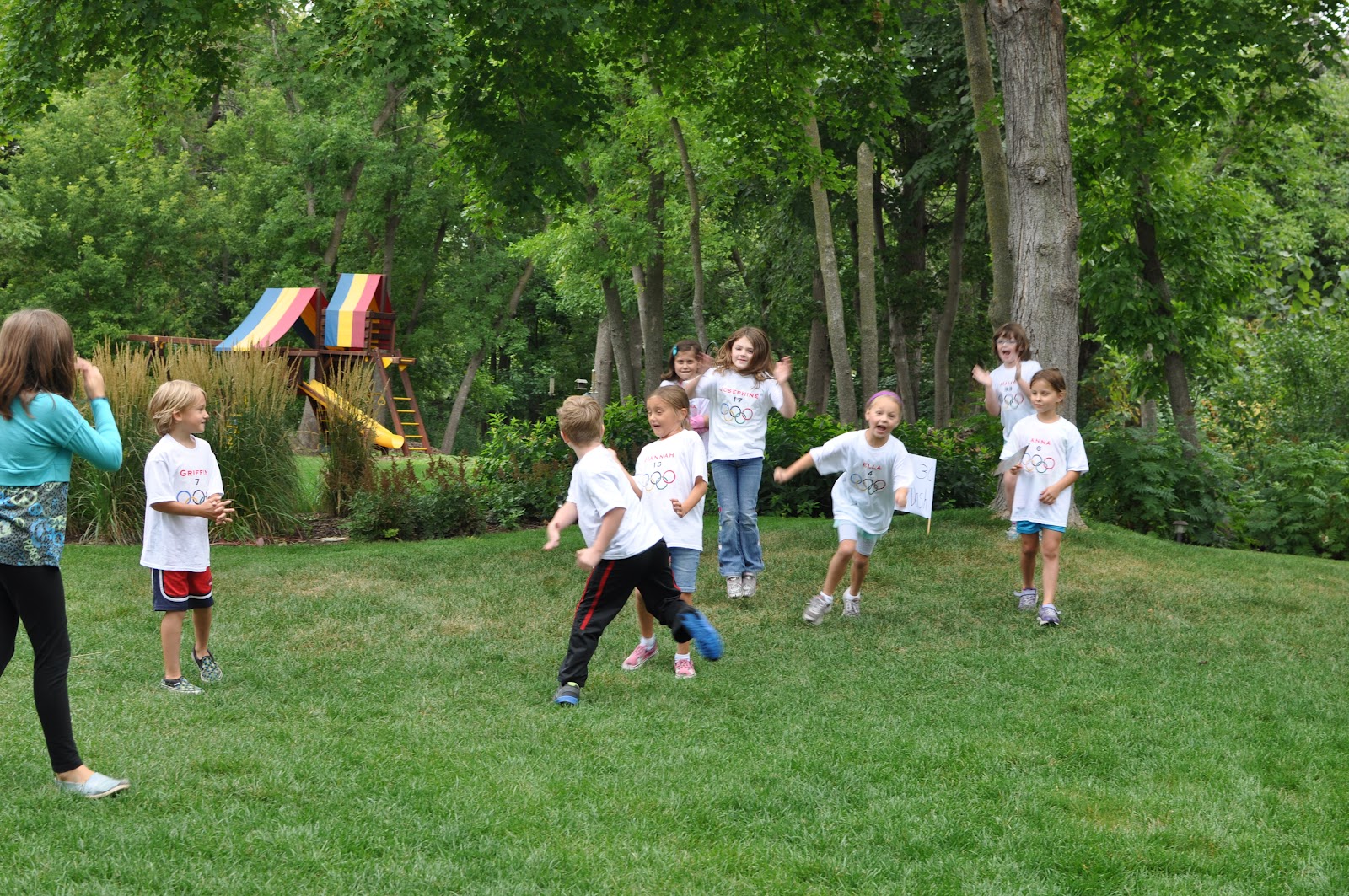 Hannah and Griff carrying the torches as everyone else waves their flags, parading around the backyard!